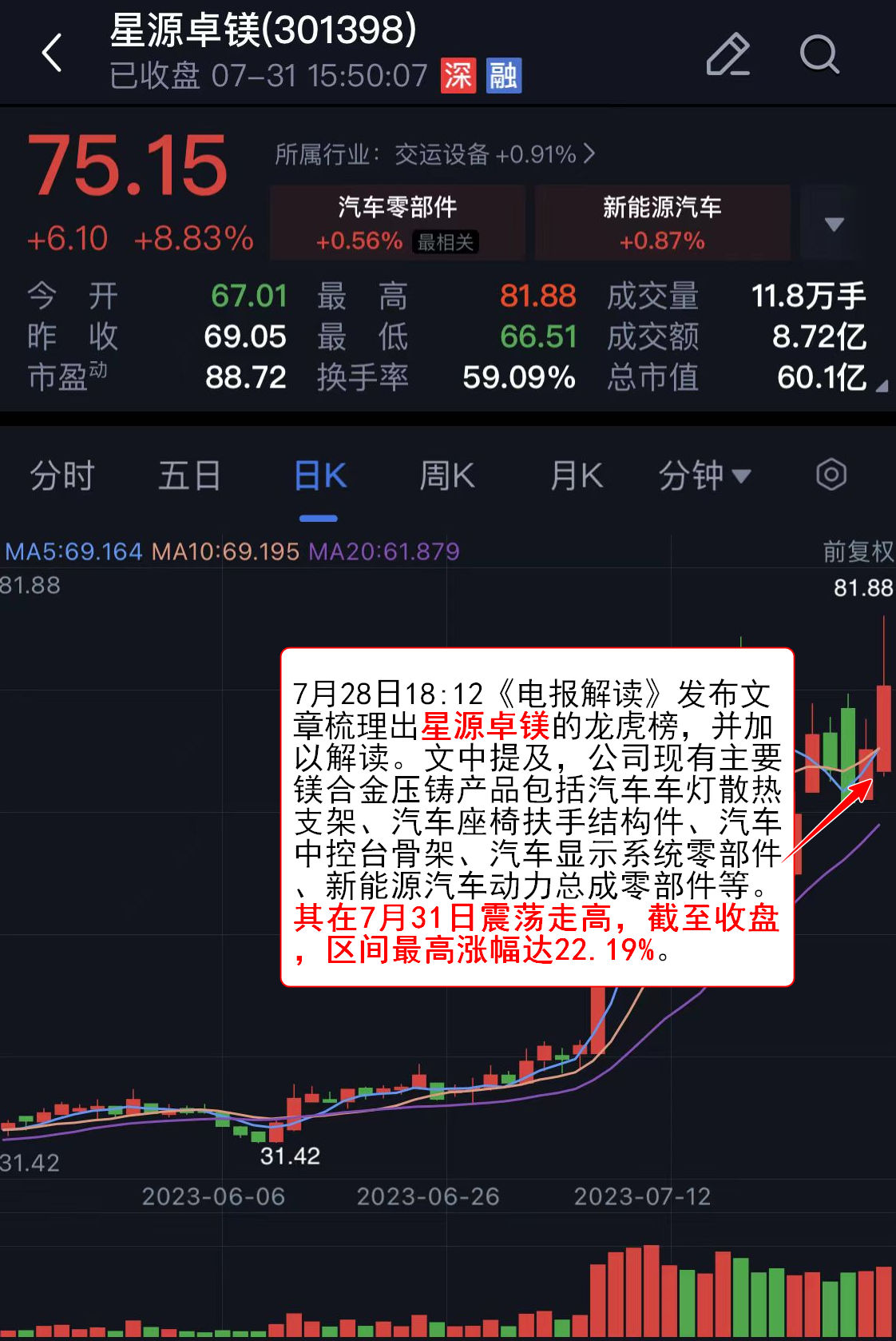 7月28日18:12《电报解读》 发布文章梳理出星源卓镁的龙虎榜 ,并加以解读。文中提及,公司现有主要镁合金压铸产品包括汽车车灯散热支架、汽车座椅扶手结构件、汽车中控台骨架、汽车显示系统零部件、新能源汽车动力总成零部件等。其在7月31日震荡走高,截至收盘,区间最高涨幅达22.19%。