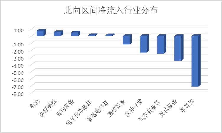 篇幅所限,本文仅列示最高和最低各5个行业。上图可见,本周科创板北向资金主要以净流出为主,总体净流入超过20亿,其中半导体、光伏设备、航空装备在流出榜排前三。
