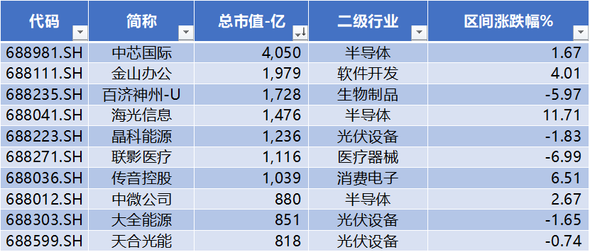 上图是本周科创50前十大权重公司市场表现,本周科创板普涨,但权重股表现并非完全一致,仍有四家公司涨跌幅为负:百济神州-U、晶科能源、联影医疗、大全能源。