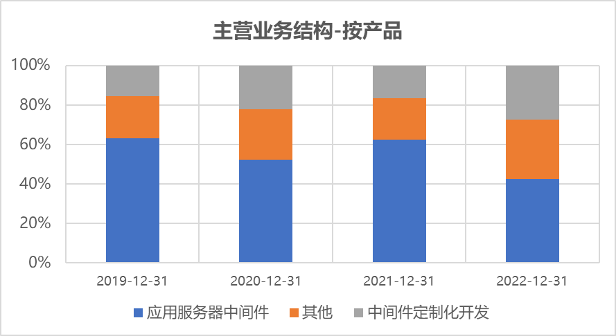 上图是公司大致经营结构,可见2019年以来应用服务器中间件占比震荡下行,至2022年底已经只有32%。