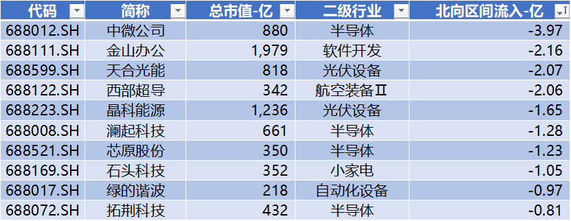上表是本周北向净流出前十名,中微公司、金山办公、天合光能分别处于流出榜前三。