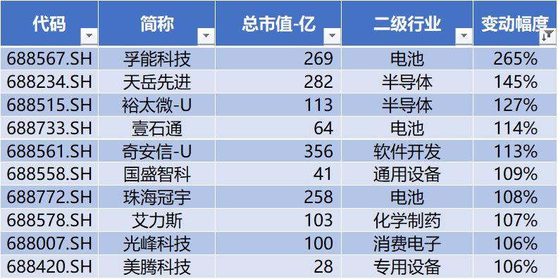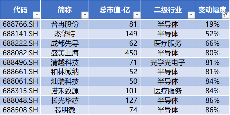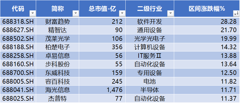 上表是本周涨幅榜前十公司,行业分布较为分散,涨幅前三名分别为:财富趋势、精智达、茂来光学。