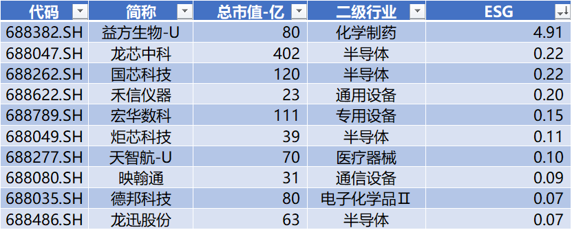 上表是ESG评分变化上升的前十家公司,前十名行业分布较为分散。