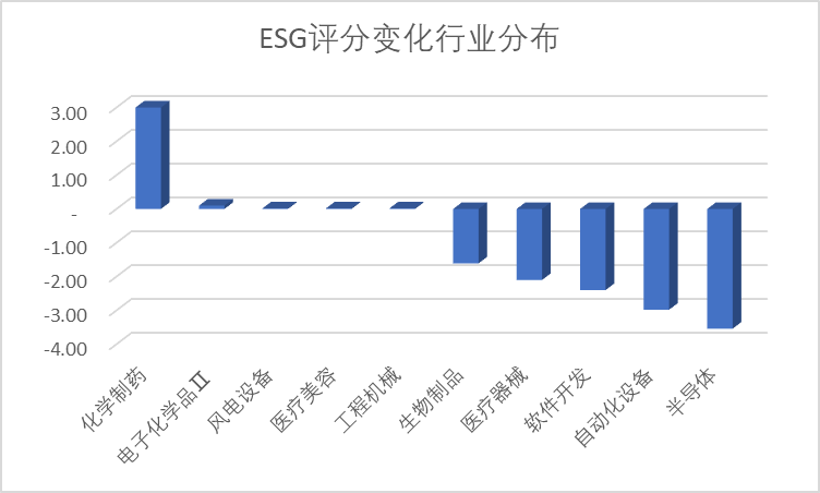 上图是本周ESG评分变化行业分布,本文统计了排名最高和最低的5个行业,本周变化趋势与以往有所不同:化学制药排第一,半导体、自动化设备、软件开发处于下降榜前三。