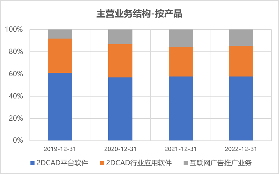公司2019年以来收入结构较为稳定,占比第一的是2DCAD平台软件,其次是行业应用软件。互联网广告推广业务占比略有提升,但幅度不大。