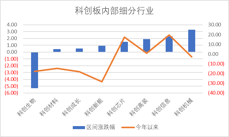 如上图所示,本周新增“科创机械”与“科创新能”两个细分行业。本周科创板普涨,内部以机械和信息板块涨幅居前,生物医药板块垫底。