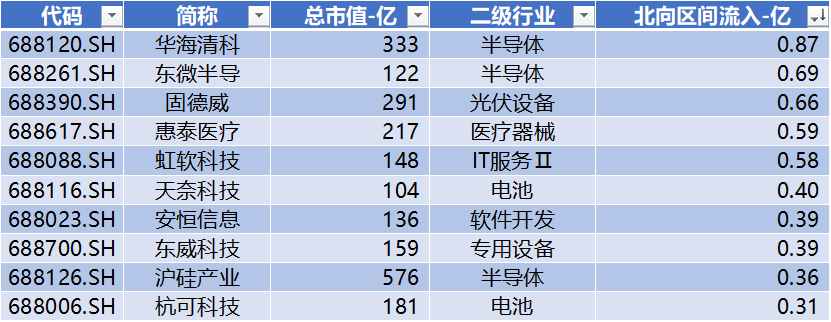 上表是本周北向净买入前十名,排名前三的是华海清科、东微半导、固德威。