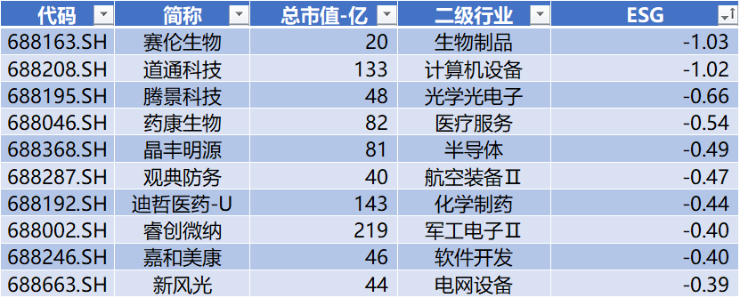 上表是ESG评分变化下降的前十家公司,与上周医药公司占比较多不同,本周行业分布较为分散。