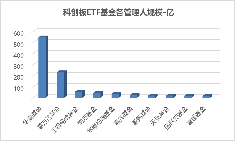 上图可见,根据最新数据,发行并管理科创板ETF基金的公募基金管理人共有19家,本文列示前十家。其中,华夏基金一家独大超过500亿,其次是易方达基金,两家都是有科创50ETF,剩余的管理人没有超过100亿。