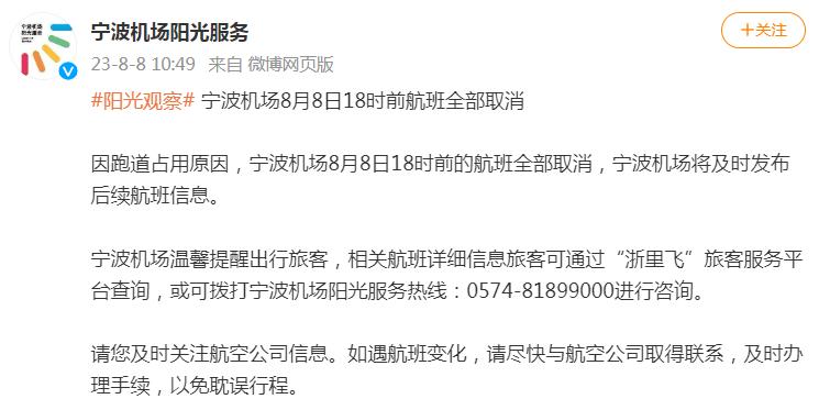 财联社8月8日讯,宁波栎社国际机场公告,因跑道占用原因,宁波机场8月8日18时前的航班全部取消,宁波机场将及时发布后续航班信息。