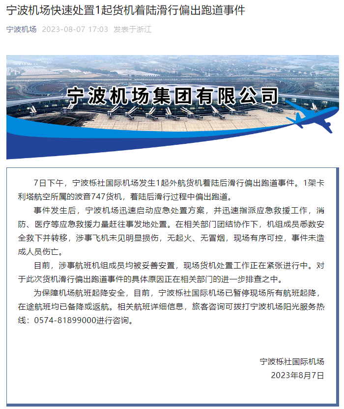 8月7日下午,宁波栎社国际机场发生外航货机着陆后滑行偏出跑道事件后,机场立即投入力量,在民航行业专家现场的全程指导下,与航空公司一起根据拟定的航空器搬移方案作现场处置。因波音747货机机身长、翼展宽、自重及运载量大,又要确保航空器搬移过程不受损,搬移难度极大,宁波机场已连续10多个小时努力,目前仍在现场处置中。