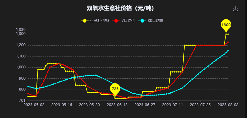 财联社8月9日讯(记者 赵子祥)一场化工企业的安全事故余波正在向产品端蔓延。随着国内安全检查趋严,双氧水价格持续走高。截至8月8日,27.5%双氧水均价逼近1300元/吨,较上月同期(800元出头)的价格上涨近500元/吨。