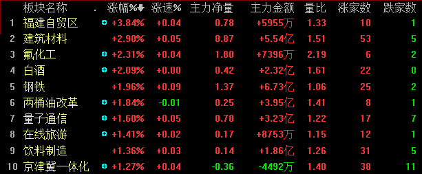 今天两市领涨板块的涨幅较昨日有所收窄,福建自贸区暴涨近4%,但其标的股较少,因此板块的涨幅存在一定的水分;建筑材料在水泥股的带动下,大涨近3%;氟化工、白酒板块均上涨2%以上;钢铁、两桶油改革、量子通信、在线旅游等板块亦有不错表现。