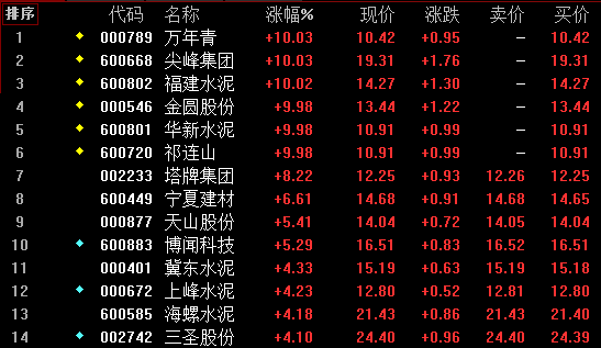 经过连续几个交易日的蛰伏后,水泥股再度迎来大爆发。万年青、尖峰集团、福建水泥、金圆股份、华新水泥、祁连山强势涨停,塔牌集团暴涨8%,宁夏建材、天山股份、博文科技均大涨5%以上,冀东水泥、上峰水泥、海螺水泥、三圣股份等个股亦有不同程度的上涨。水泥股经过第一波大涨行情,小幅调整后再度出现集体性行情,今天的行情可以看作是调整后的第二波行情。对于第二波行情而言,具有一定的持续性和可操作性,但持续时间和资金炒作力度将不如第一波的行情,龙头个股的变换也将更快更频繁,龙头股的稳定性也将下降。