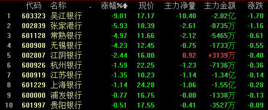 次新银行股的爆发在今天告一段落,个股均出现不同程度的调整。吴江银行暴跌9%,几近跌停;张家港行、常熟银行、无锡银行均下跌4%以上;江阴银行、杭州银行、江苏银行等个股亦有不同程度的下跌。次新银行股今天的表现,印证了江左昨日的判断,昨日尾盘吴江银行打开涨停板,江左便判断行情可能结束。经过前期的大涨后,短时间内次新银行股难有大行情,因此不建议小伙伴们盲目抄底介入。