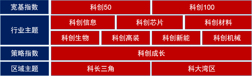 为发挥科创板的投资价值与挖掘市场优势,突出科创板高成长性等优势,为广大投资者提供更为丰富的投资渠道和投资标的,上交所和中证指数公司已围绕科创板推出12条指数,初步形成层次丰富且各有侧重科创板指数体系,包括以科创50、科创100为核心的宽基指数,新一代信息技术、生物医药、科创芯片为代表的行业主题指数,以科创长三角为代表的区域主题指数,以科创成长为代表的策略指数。