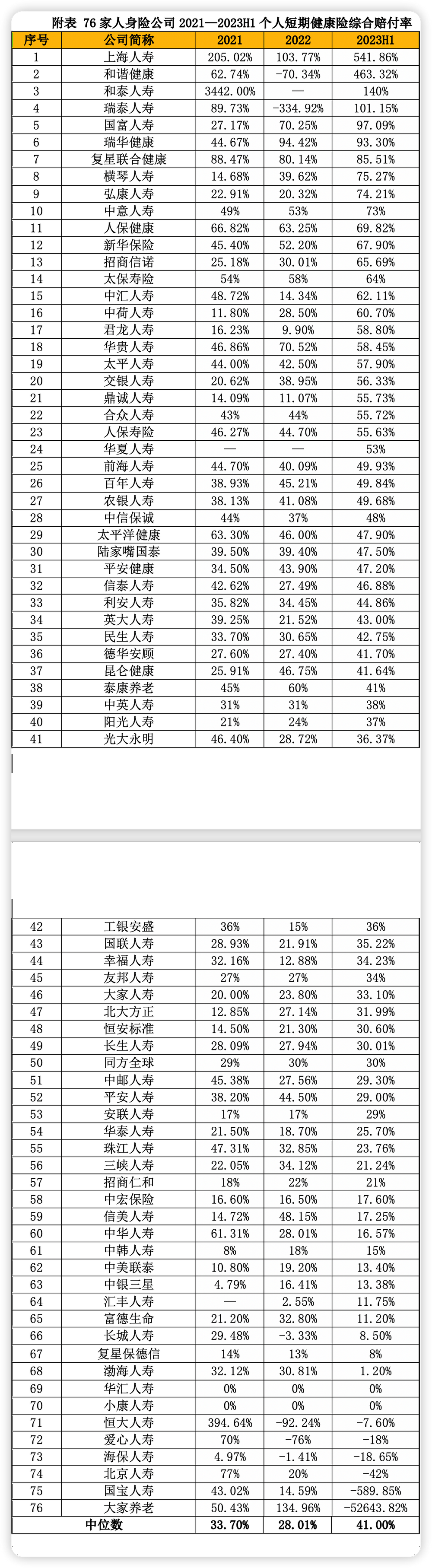 上半年76家人身险公司短期健康险综合赔付率中位数41%,创近3年来新高