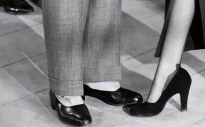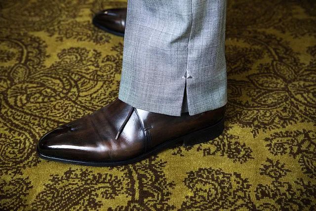 此外,前高后低的马蹄口让裤子与鞋子的线条连接更加和谐,视觉垂顺感更好。Military hem(即斜裤脚)一般叫做“马蹄口”,指的是裤口前高后低的做法。关于这种裤型的来源有一种说法:当裤长正好压鞋面的时候,后侧靠不到鞋跟,裤脚甩来甩去不太雅观,所以做了前短后长的处理。裤脚没有翻边的时候,“马蹄口”能做到前后3cm的差别,有翻边的时候可以做到约15cm左右的差别。“马蹄口”曾是定制长裤的标配之一。