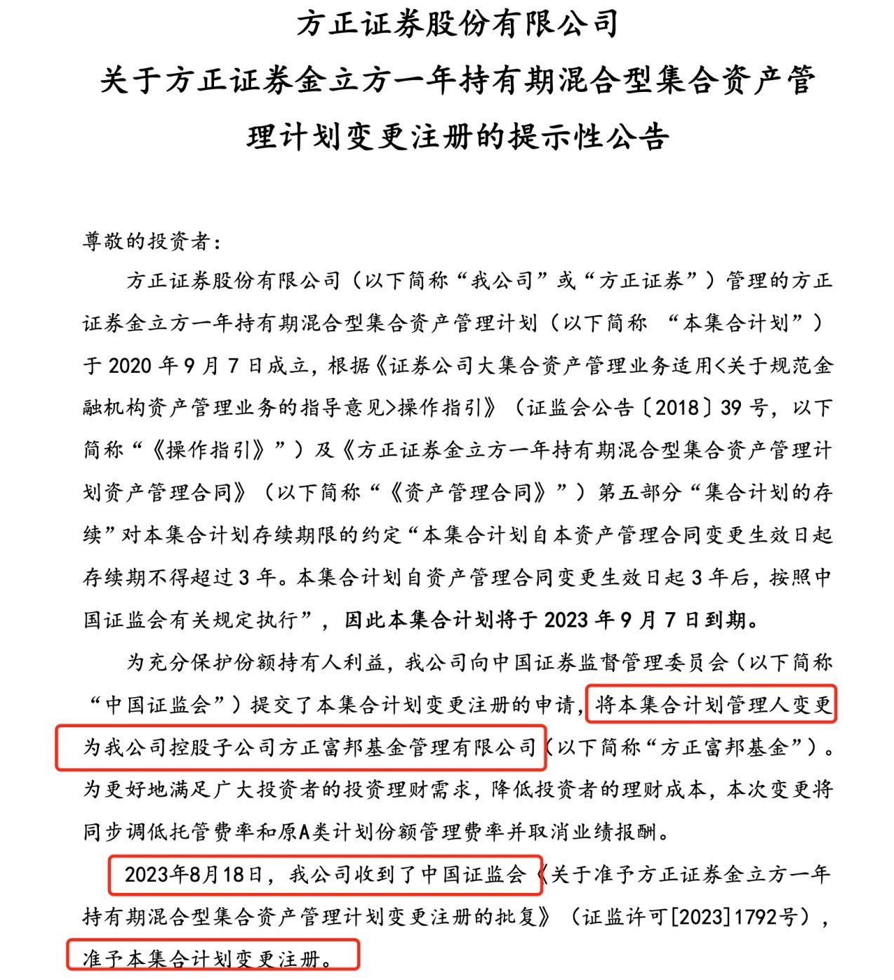 方正证券金立方一年持有期混合型集合资管计划公告显示,该资管计划成立于2020年9月7日,根据相关指引及合同约定,存续期不超过三年,将于2023年9月7日到期。为了更好维护持有人利益,避免产品清盘,方正证券选择了向证监会申请变更注册,将金立方管理人变更为控股子公司方正富邦基金,由方正富邦基金继续管理。