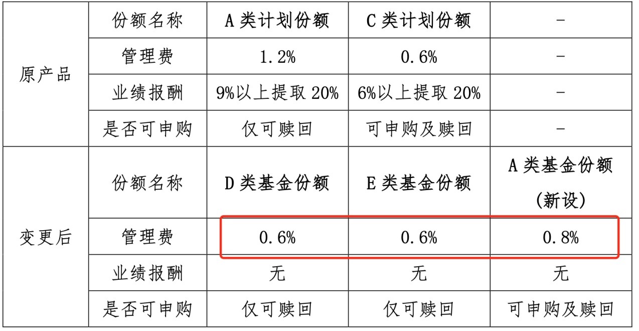 份额设置方面的变更略复杂,由原A类计划份额调整为D类基金份额,只开放赎回,不开放申购,不设置最短持有期限;原C类计划份额调整为E类基金份额,只开放赎回,不开放申购,保留一年最短持有期限设置。