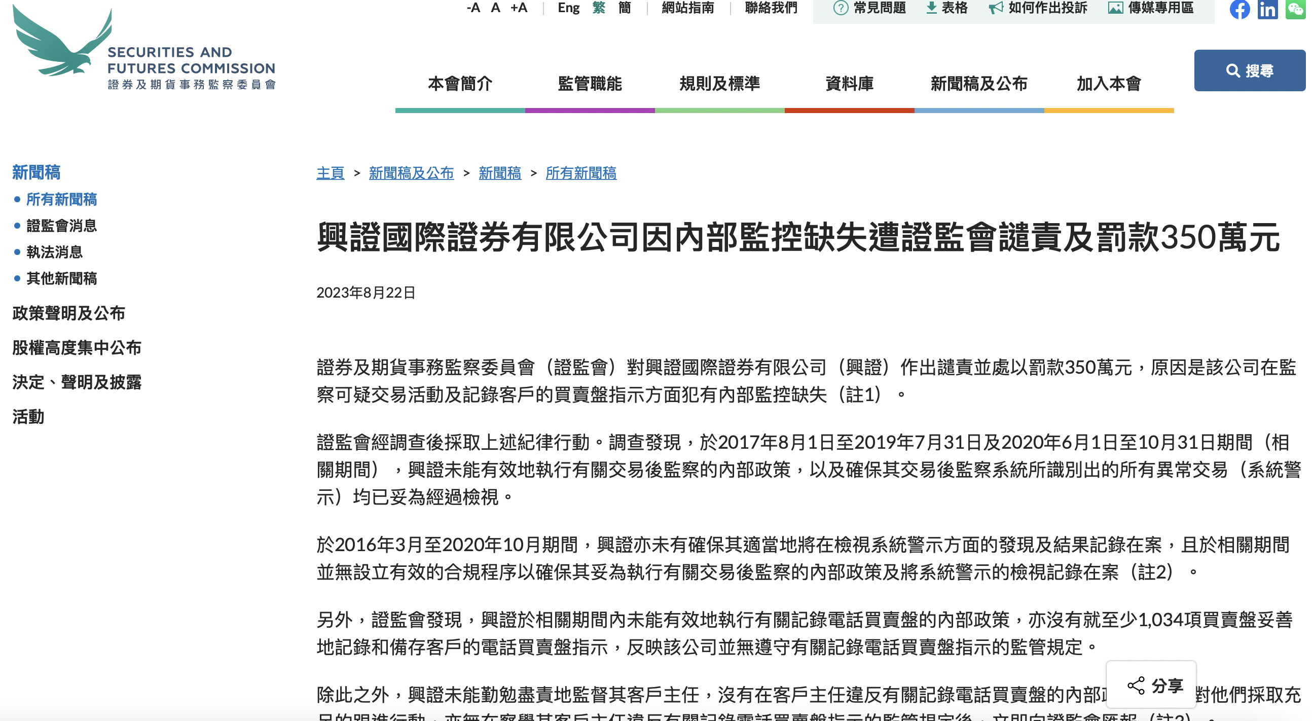 此外,香港证监会今日公告,对兴证国际证券有限公司作出谴责并处以罚款350万港元,原因是该公司在监察可疑交易活动及记录客户买卖盘指示方面犯有内部监控缺失。