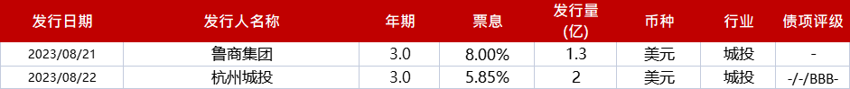 杭州城投发行3年期期限,以美元为基准的高级无抵押债券,发行票息为5.85%,规模2亿美元,债项评级:-/-/BBB-