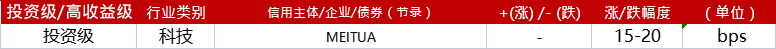 二级市场方面,中资美元债市场情绪有所回暖。国企板块方面,中化收窄5-10bps左右;科技板块方面,高贝塔名字如美团收窄15-20 bps,标杆债券名字如腾讯,阿里等收窄6-8bps;金融板块方面,AT1方面价格基本持平,AMC方面市场情绪有所反弹,华融曲线整体上涨2pts左右;城投板块维持平静;地产板块,投资级方面,龙湖上涨约1-2pts,高收益方面,金地、新城等下跌约1pt。