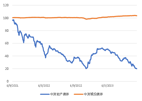 图2. 中资房地产、城投板块美元债指数走势(基准=100)
