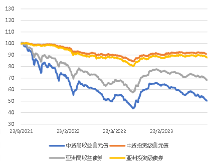 图1. 中资及亚洲美元债指数走势(基准=100)
