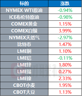 COMEX黄金期货收涨1.15%,报1948.1美元/盎司;COMEX白银期货收涨3.99%,报24.38美元/盎司。
