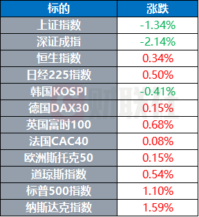 美东时间周三,美股高开高走,三大指数集体收涨。纳指涨1.59%,标普500指数涨1.1%,道指涨0.54%。大型科技股普涨,奈飞、英伟达涨超3%,Meta、谷歌、苹果涨逾2%,微软、特斯拉涨超1%,亚马逊小幅上涨。