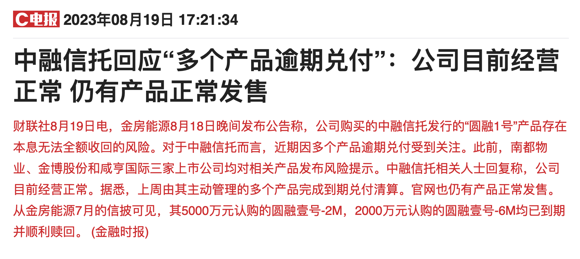 财联社8月26日讯(编辑 俞琪)自多家A股上市公司公告购买的中融信托产品发生逾期兑付后,这场信托兑付风波仍在发酵。中融信托上周六回应称,公司目前经营正常,仍有产品正常发售。卷入停兑传闻中的光大信托、五矿信托也已发布公告辟谣称停兑为相关不实言论。但是,购买信托公司产品的上市公司和投资人的担忧似乎仍未消散。