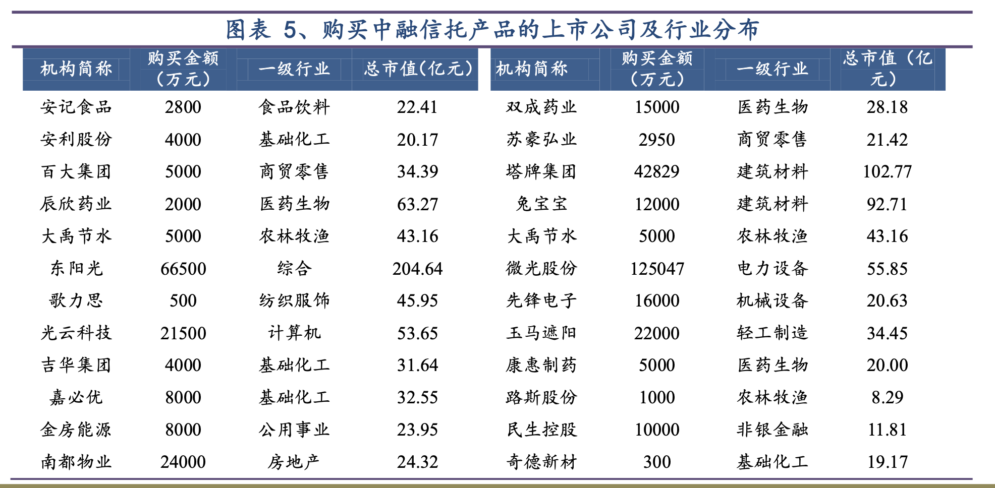 对于日前有产品已经出现违约的中融信托,又有哪些上市公司在买入?太平洋证券夏芈卬在8月21日研报中表示,2022年8月17日至2023年8月17日,购买中融信托产品的上市公司主要集中于基础化工、医药生物、农林牧渔等行业,其中总市值低于50亿元的公司一共18家,占比高达75%。购买金额最大的是微光股份(12.5亿元),东阳光、光云科技、南都物业、双成药业、塔牌集团、兔宝宝、先锋电子、玉马遮阳和民生控股购买金额均超过1亿元。