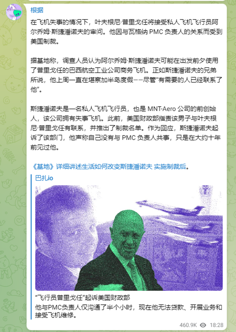 与俄罗斯安全部门相关的Telegram频道Baza爆料,斯捷潘诺夫将接受审问。此前他因为和普里戈任的密切关系受到美国制裁,调查人员认为他在飞机失事前使用了该飞机,从而动了一些手脚。