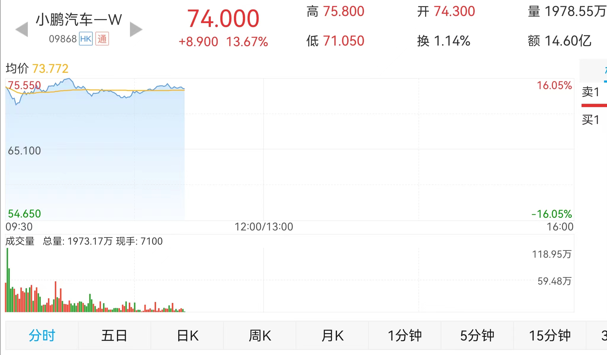 财联社8月28日讯(编辑 童古),小鹏汽车-W(09868.HK)今日大幅高开后高位震荡,截至发稿涨13.67%报74港元,成交超15亿港元。该公司早间发布公告称,将收购滴滴智能汽车开发业务资产,收购的最高总对价约为港币58.35亿元。双方战略合作的核心是将打造一款A级智能电动汽车。
