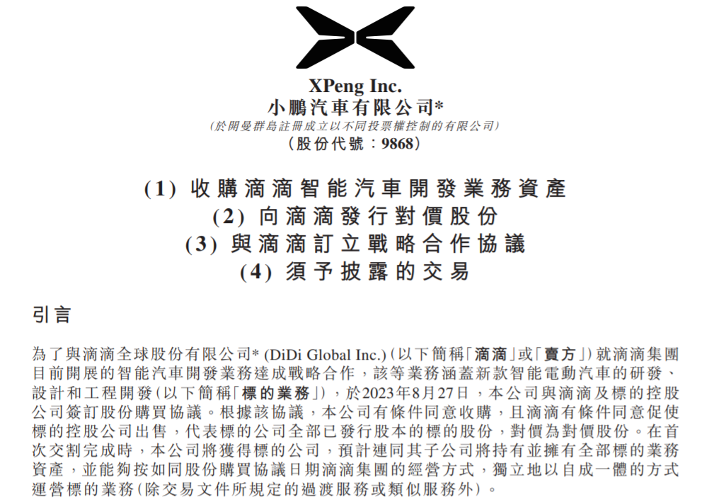 为推动双方建立长期共赢的战略合作关系,小鹏汽车将发行占交易完成后总股本3.25%的A类普通股,收购滴滴旗下智能电动汽车项目相关资产和研发能力。滴滴将成为小鹏汽车的战略股东,首批股份的锁定期为24个月。