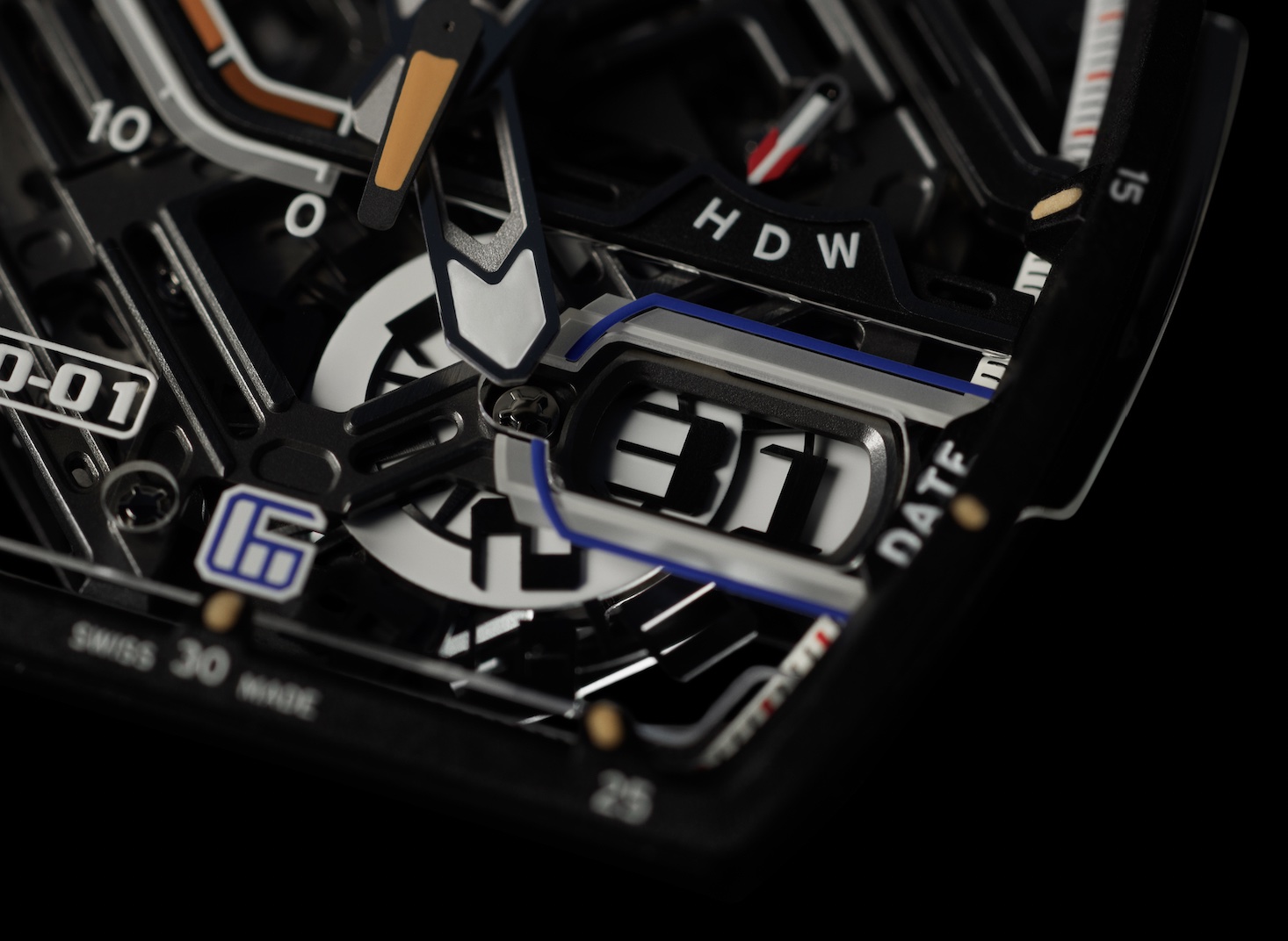 功能选择器同样为日常使用提供了便利,佩戴者仅需按下位于2点钟位置的按钮,便可轻松选择所需的模式。指示器位于表盘的超大日期视窗上方,全天候显示所选模式:W表示上链功能,D表示日期设置,H表示指针调校。