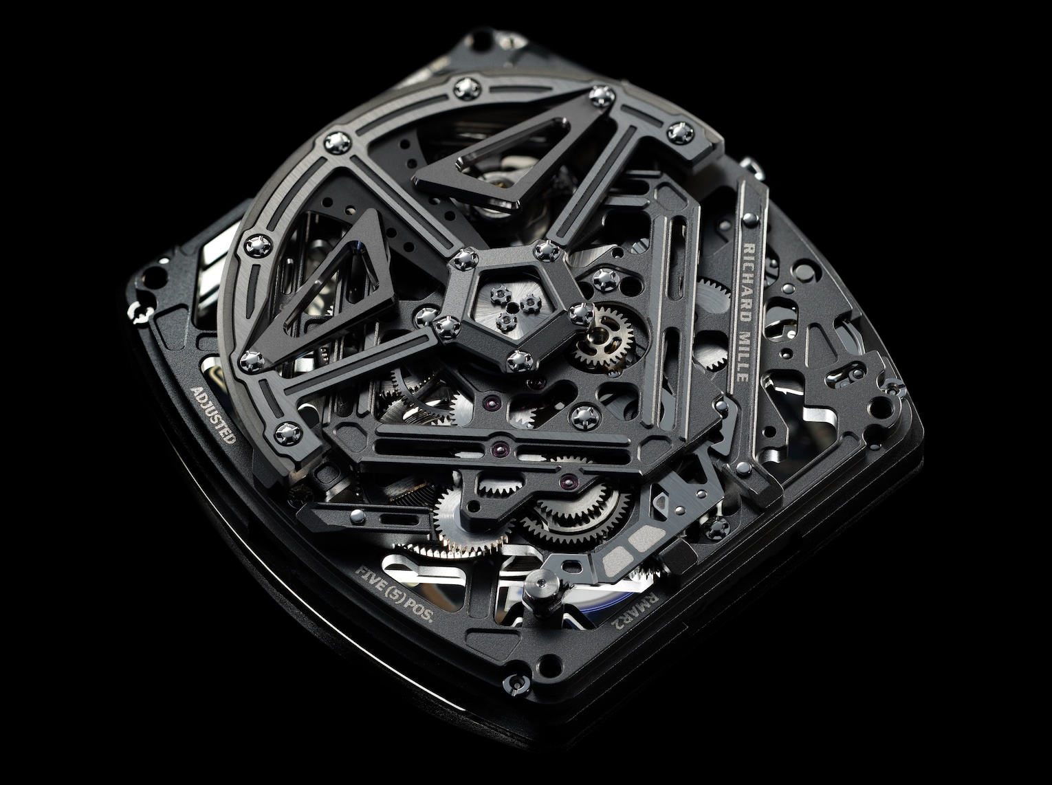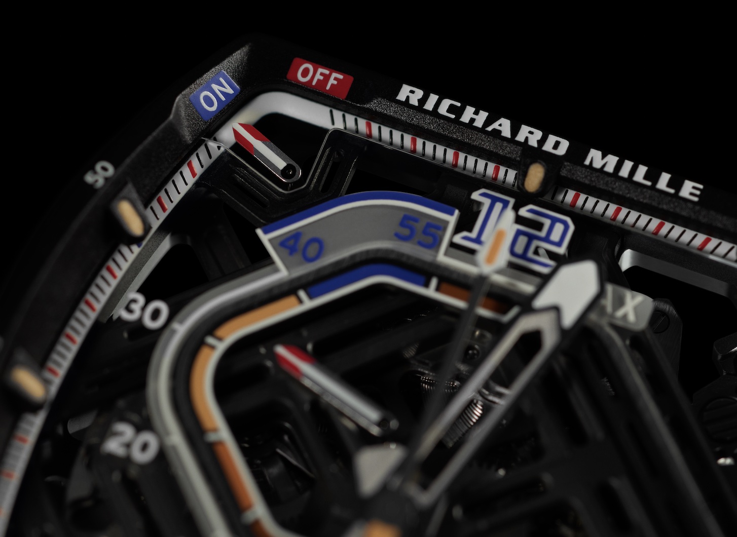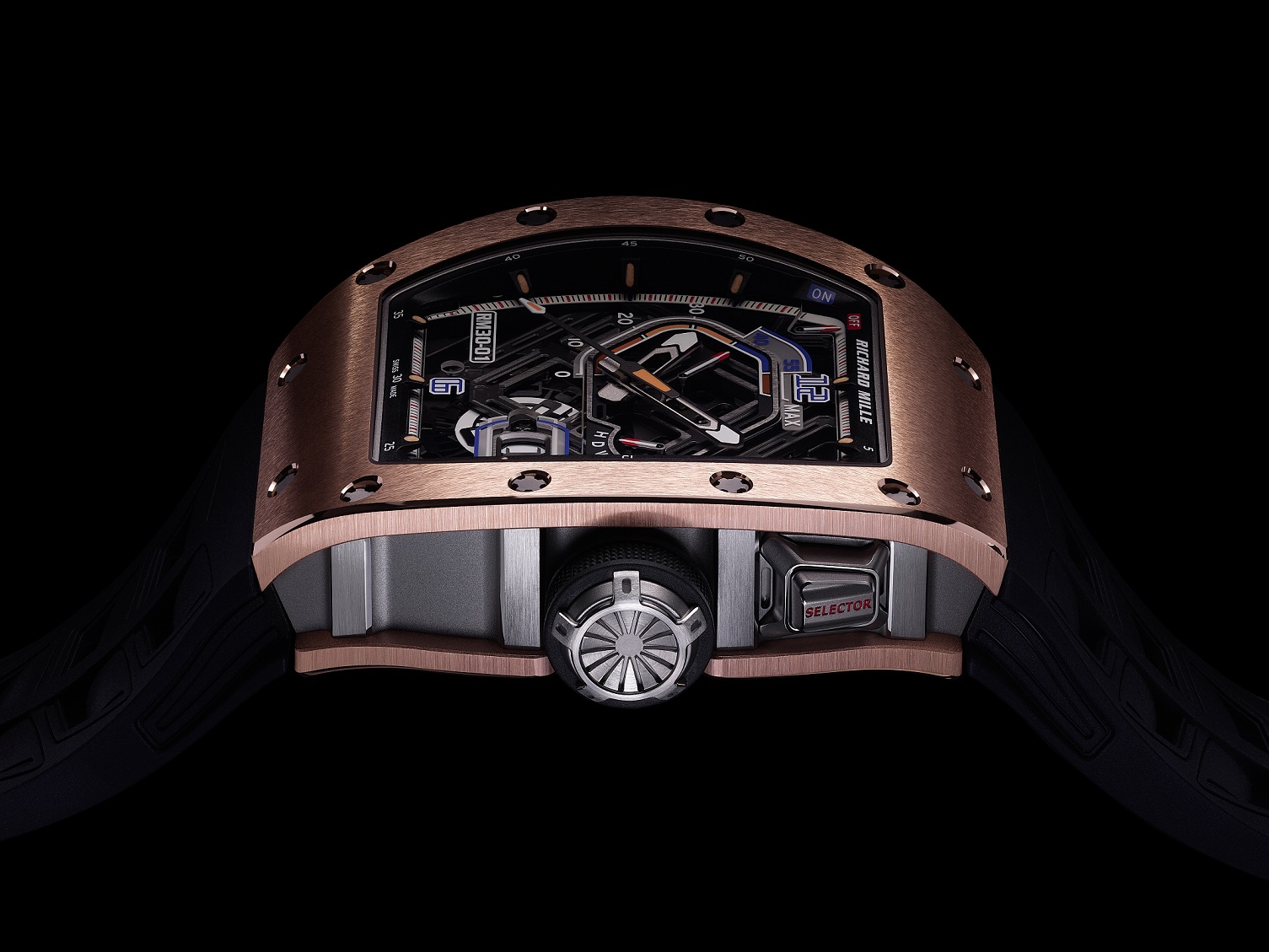 新款RMAR2自动机芯的复杂结构并未削减美学表达,更优化了人体工程学设计和使用。功能选择器的齿轮和超大日期显示盘等部件都展示了表盘上的动感造型。