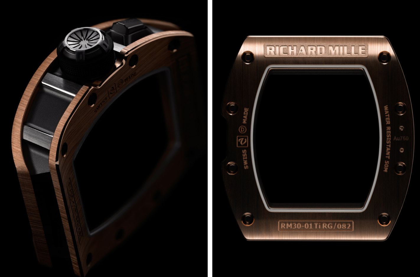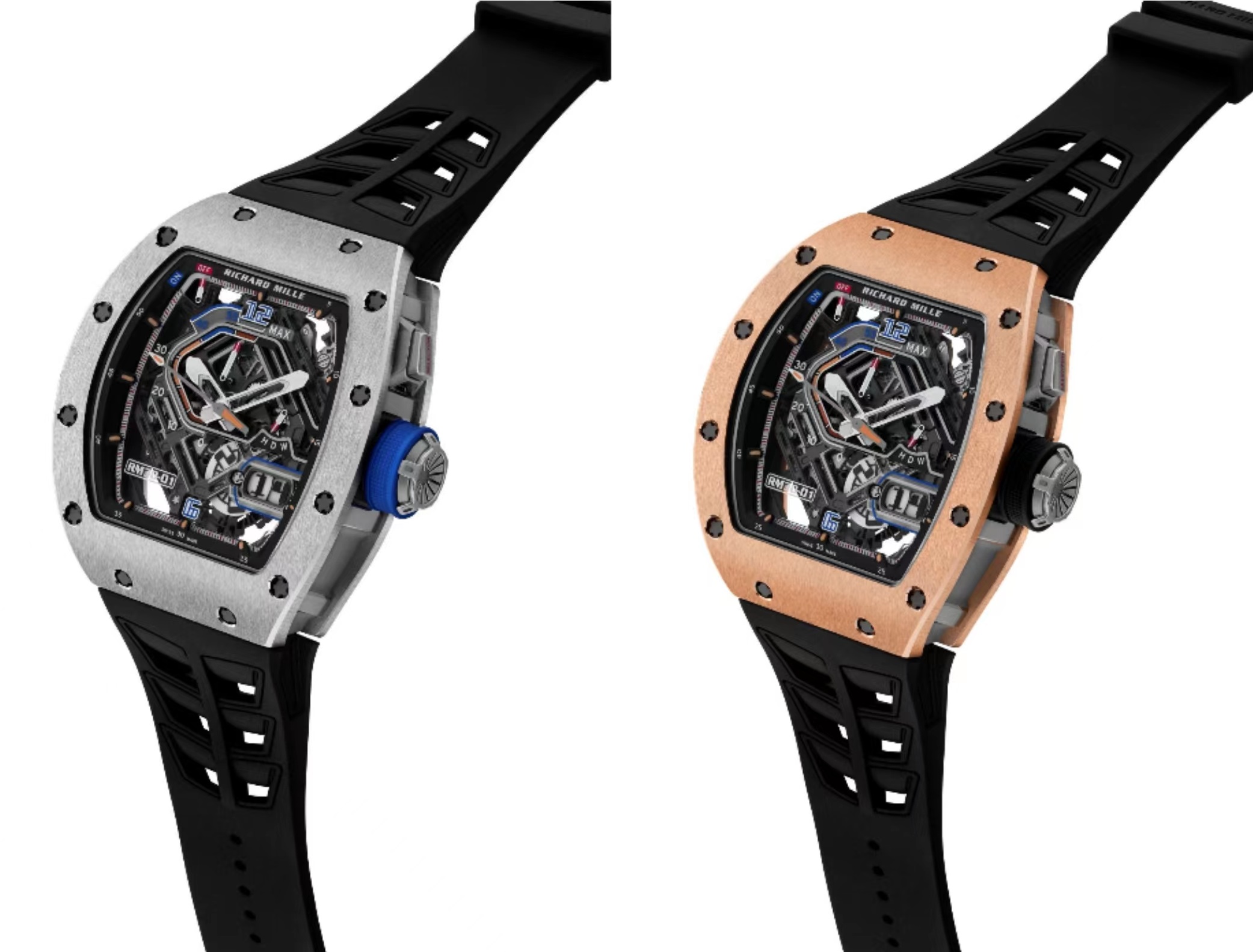 新款腕表推出两个不同材质版本,都展现出其酒桶型表壳的雕塑感。一款采用5N红金打造底盖和表圈,搭配五级钛合金中层表壳;另一款则全部采用五级钛合金打造,该材质具备出色的抗过敏、抗腐蚀和耐冲击特性。腕表的重量已尽可能地减轻(包括表带在内仅重96克),其人体工程学设计也为佩戴者带来舒适体验。无论是五级钛合金与5N红金搭配的版本,或是通体五级钛合金的版本,皆采用相同的表面处理工艺(缎面打磨、切斜边抛光等))进行修饰,且表壳具有紧凑的线条和复杂的几何结构。