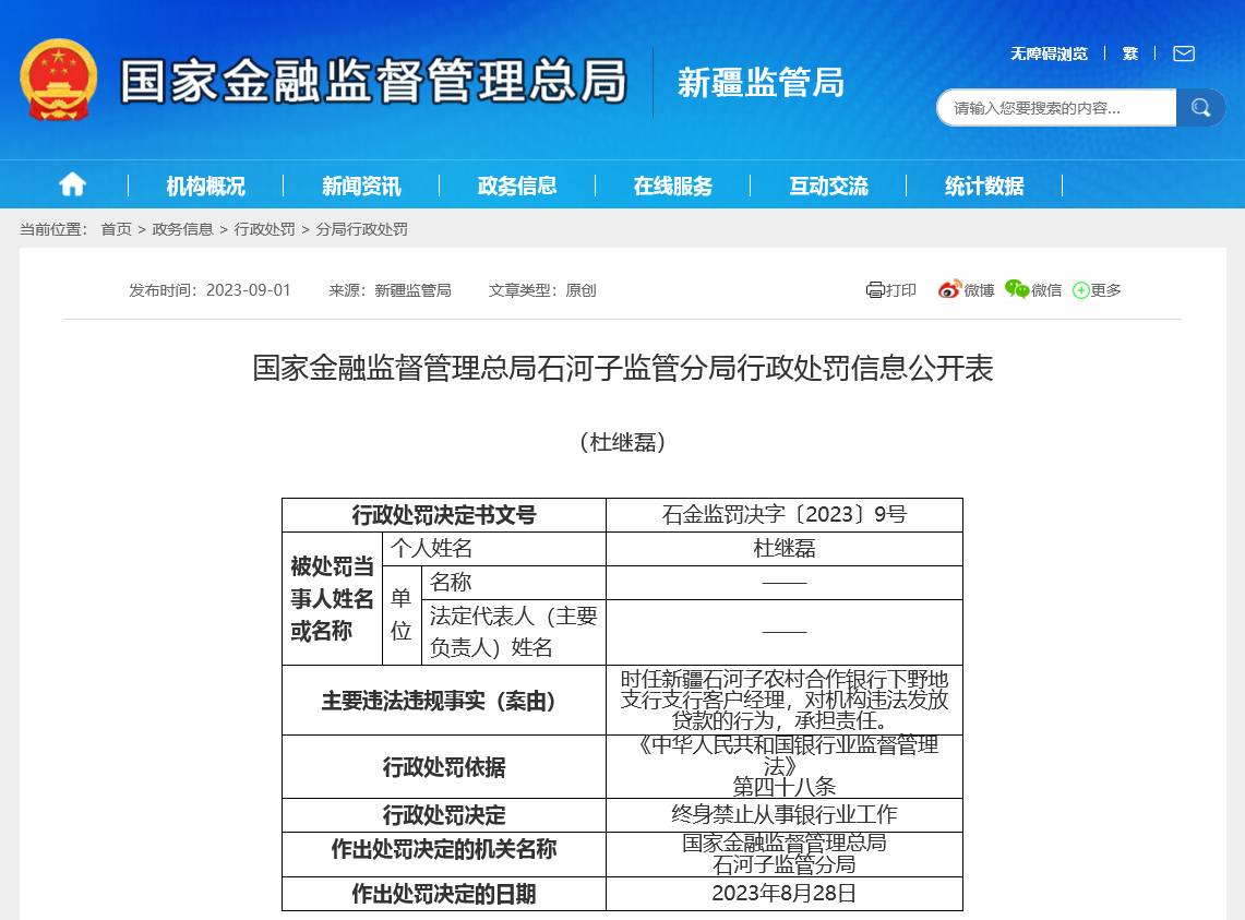财联社9月4日讯(记者 彭科峰)古语云,上梁不正下梁歪。国家金融监督管理总局官网日前发布信息称,石河子农村合作银行某支行客户经理杜继磊因为违法放贷被终身禁业。