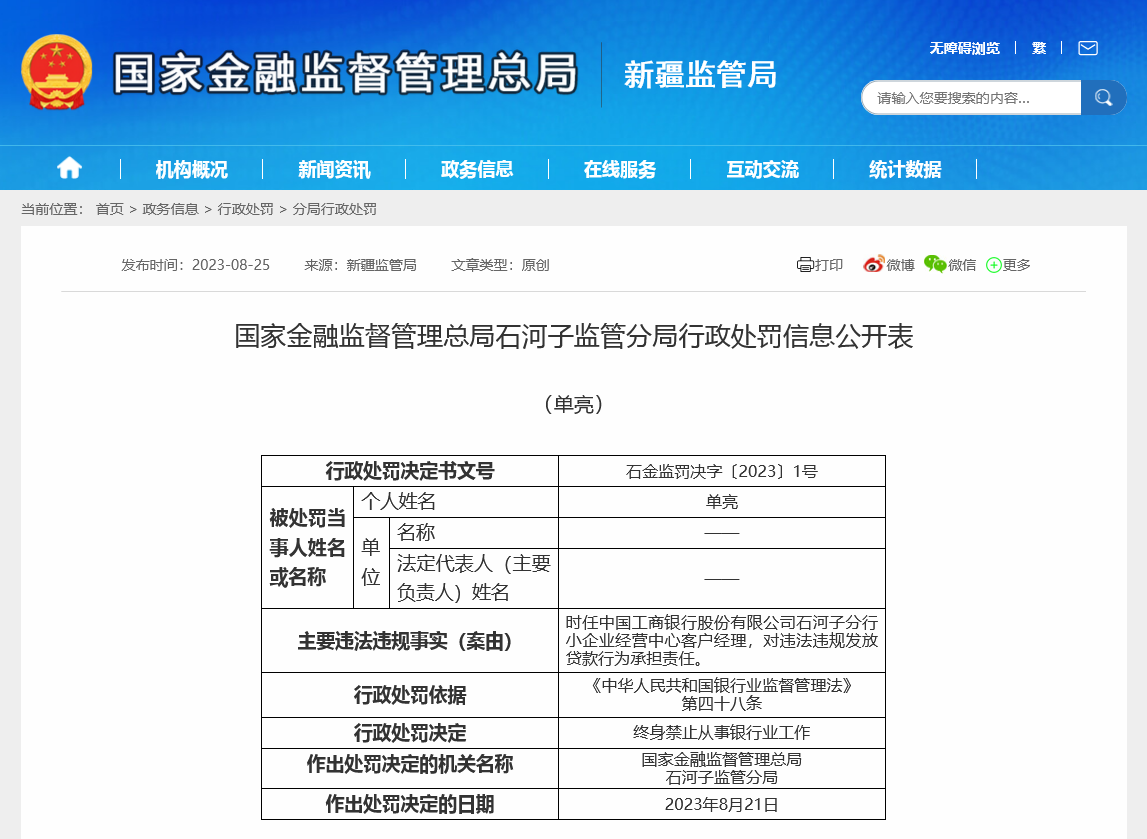 财联社记者注意到,此前不久,当地也有信贷人员因为违规放贷被终身禁业。8月25日,监管部门发布信息称,时任中国工商银行股份有限公司石河子分行小企业经营中心客户经理单亮,因为对违法违规发放贷款行为承担责任,被终身禁止从事银行业工作。
