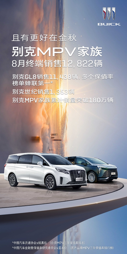 8月,别克MPV家族终端销售12,822辆。其中,别克GL8销售11,438辆,今年1-8月累计销量76,870辆,以领先产品实力和卓越体验,继续书写“以一个车型定义一个市场”的传奇;别克世纪CENTURY自去年11月上市以来,迅速赢得高端消费者的关注与青睐,至今年5月累计销量已突破1万辆,近期更连续三个月问鼎50万元以上大型豪华MPV销量榜首。别克深耕MPV领域二十余载,随时代变迁与用车场景变化赋予MPV更多内涵,在满足消费者宜商宜家出行需求的同时,持续巩固在MPV市场的标杆地位。