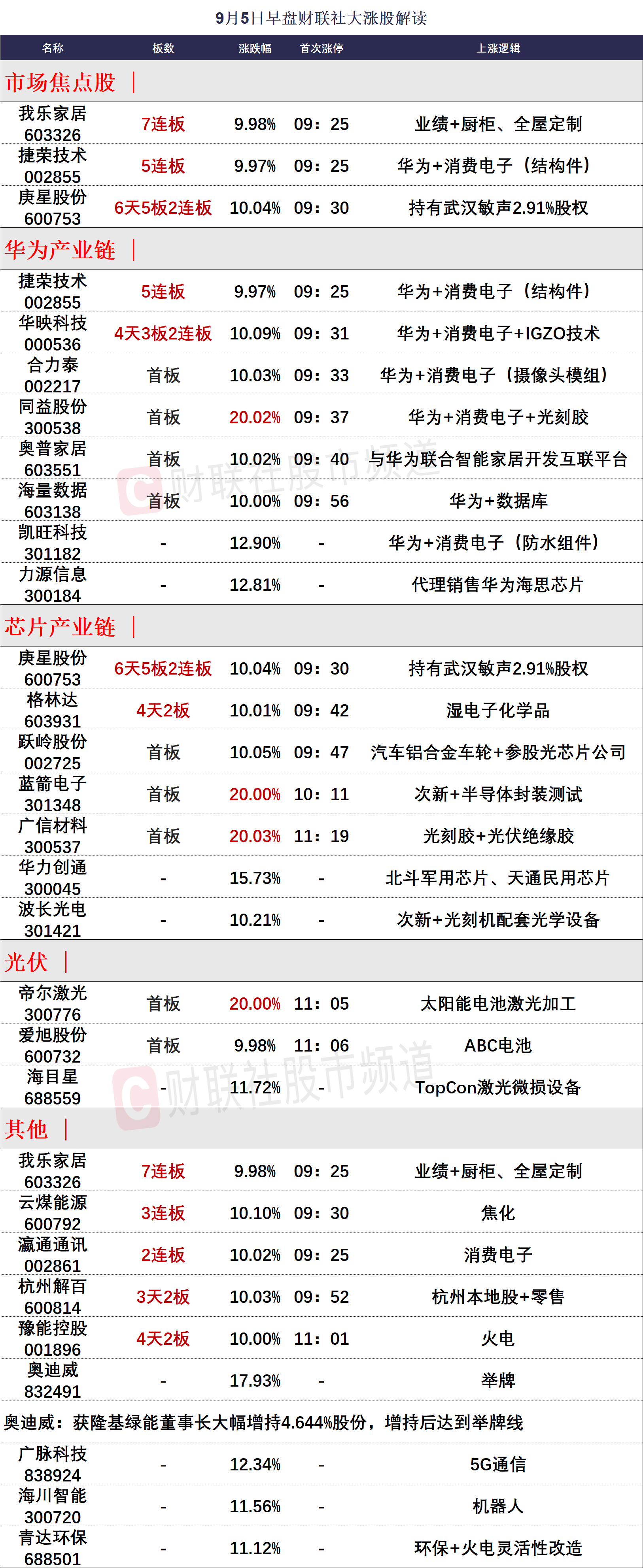 个股来看,今日两市共18只个股涨停(不包括ST及未开板新股),13股未封住涨停,两市炸板率为39%。早盘连板股数量6家,其中我乐家居7连板,捷荣技术5连板,云煤能源3连板、华映科技、瀛通通讯、庚星股份2连板。