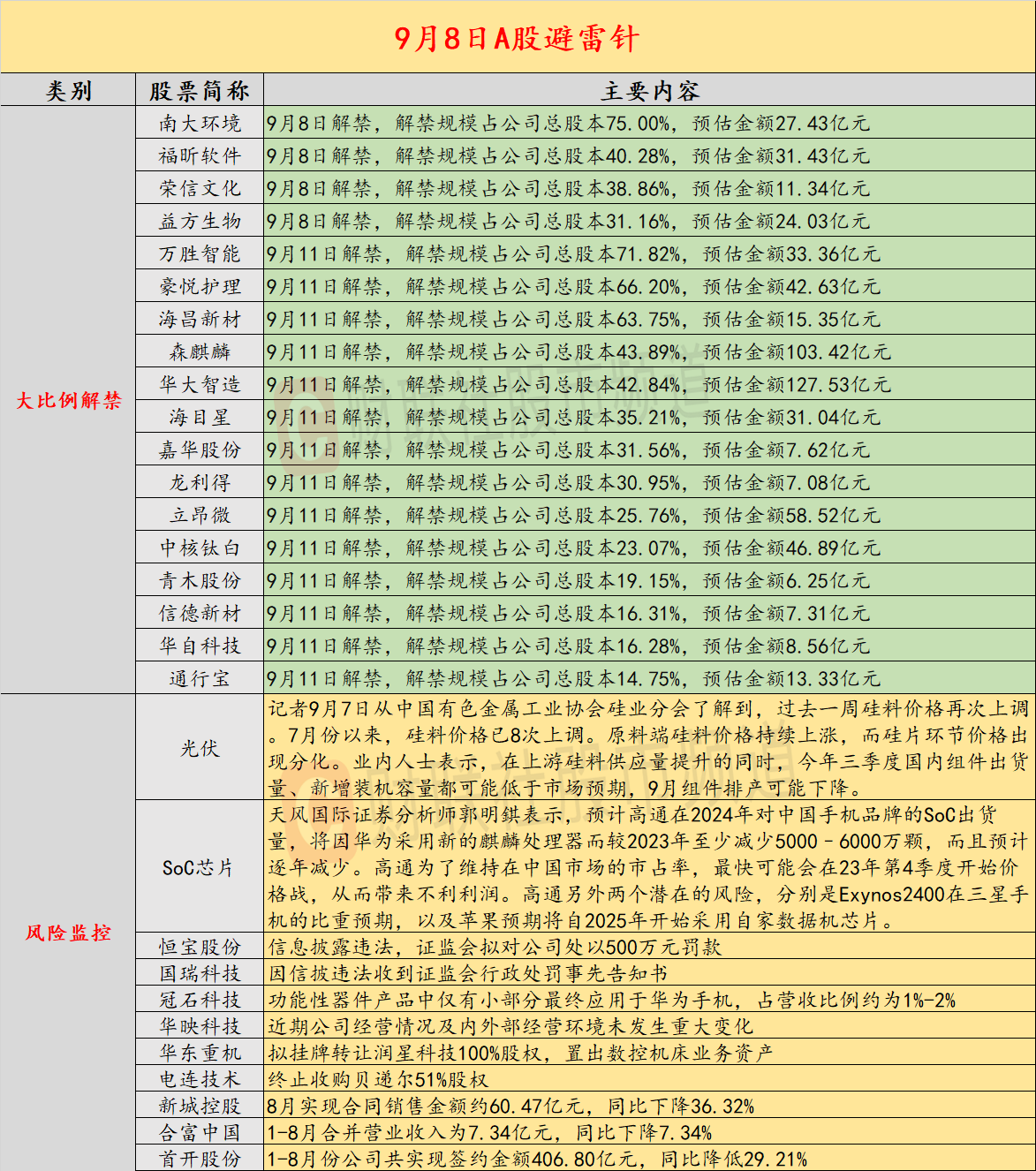 【9月8日股市避雷针】昨日没有公司发布减持公告;南大环境、万胜智能将迎来超七成以上解禁;硅料价格“八连涨”,业内人士表示9月组件排产可能下降;恒宝股份信息披露违法,证监会拟对公司处以500万元罚款;知名分析师郭明錤表示,为维持SoC芯片市占率,高通最快可能在今年第4季度开始价格战;国瑞科技因信披违法收到证监会行政处罚事先告知书;美股三大指数收盘涨跌不一,纳斯达克中国金龙指数收跌4.02%。