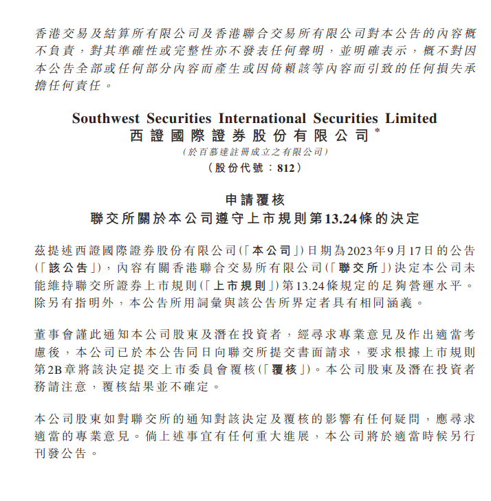 当时西证国际证券指出,该公司于9月15日收到香港联交所发出的函件,联交所作出决定,因公司未能维持联交所证券上市规则规定的足够营运水平及拥有相当价值的资产以保证其股份继续上市。除非公司就联交所的决定申请复核,否则公司股份将于9月27日暂停买卖。