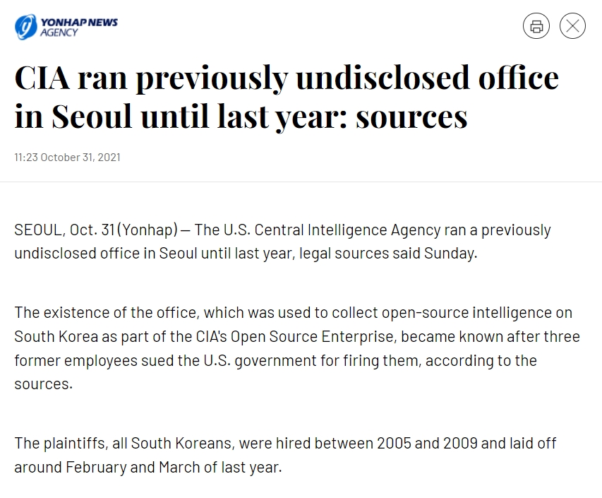 作为背景,CIA的开源企业部门(Open Source Enterprise)近些年也曾引发过国际舆论哗然。据韩联社2021年报道,该部门曾长期秘密在首尔设立办公室,主要工作是收集并翻译公开渠道信息。这件事情曝光的原因,是因为3名为该办公室效力10余年的韩籍员工遭裁员后将其告上法庭。不过韩国法院以“没有对美国政府行为的管辖权”为由驳回了相关诉讼。