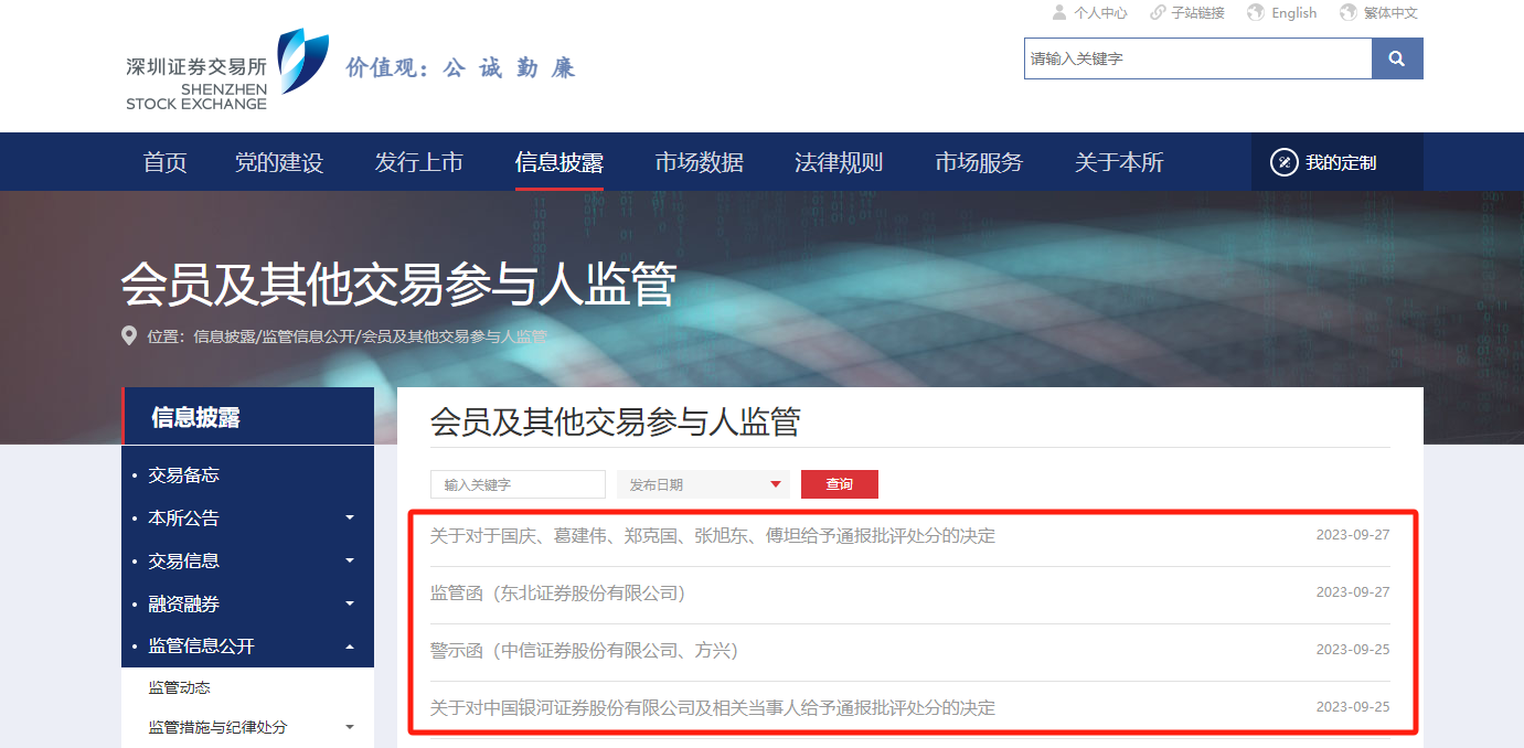 此外,两家头部券商也于本周一被深交所“教训”。9月25日,中信证券及公司首席信息官兼信息技术中心行政负责人方兴被采取书面警示的自律监管措施;同日,银河证券及公司保荐代表人陈召军、姚召五被给予通报批评处分。