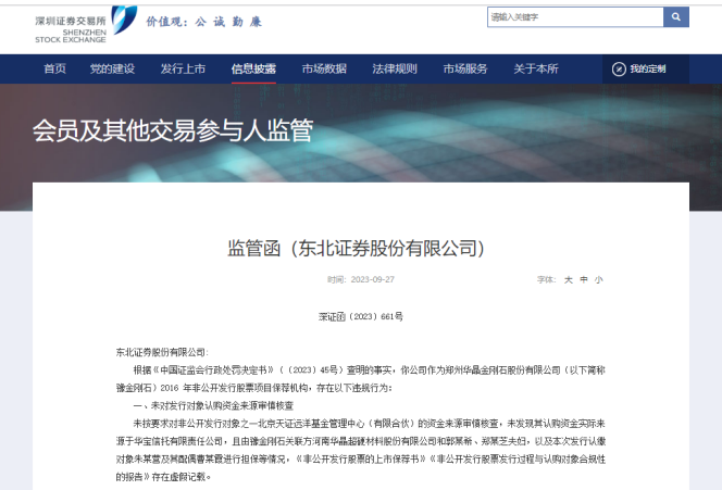 东北证券未按要求对非公开发行对象之一北京天证远洋基金管理中心(有限合伙)的资金来源审慎核查,未发现其认购资金实际来源于华宝信托,且由豫金刚石关联方河南华晶超硬材料股份有限公司和郭某希、郑某芝夫妇,以及本次发行认缴对象朱某营及其配偶曹某霞进行担保等情况,《非公开发行股票的上市保荐书》《非公开发行股票发行过程与认购对象合规性的报告》存在虚假记载。