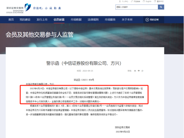 由此,上交所对中信证券和首席信息官兼信息技术中心行政负责人方兴,采取书面警示的监管措施。
