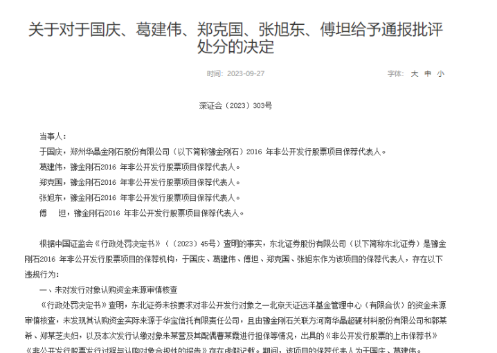 东北证券及5名保荐代表人的罚单,与保荐豫金刚石2016年非公开发行股票项目有关。